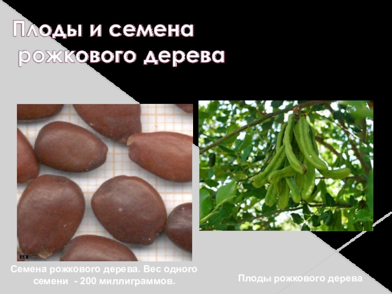Слайд 4Семена рожкового дерева. Вес одного семени - 200 миллиграммов.