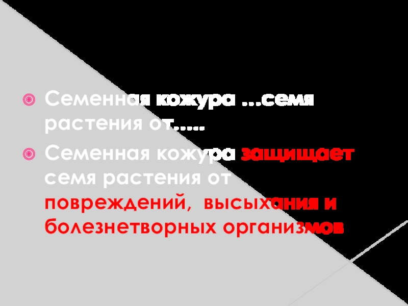 Семенная кожура …семя растения от…..Семенная кожура защищает семя растения от повреждений, высыхания и болезнетворных организмов