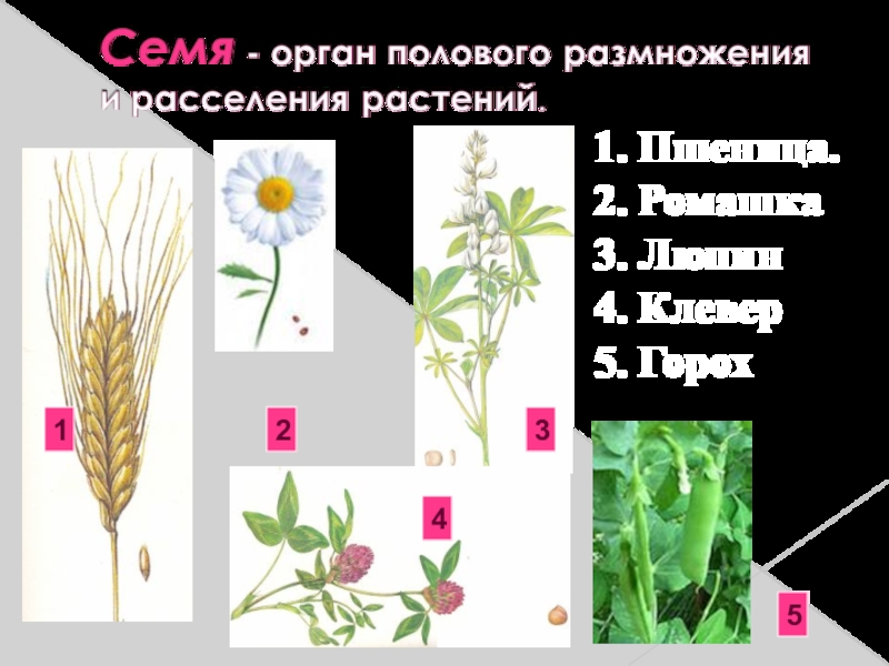 1. Пшеница. 2. Ромашка3. Люпин4. Клевер5. Горох12345