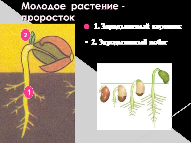 Зародыш семени однодольного растения состоит из зародышевого корешка , зародышевого побега и одной семядоли.
