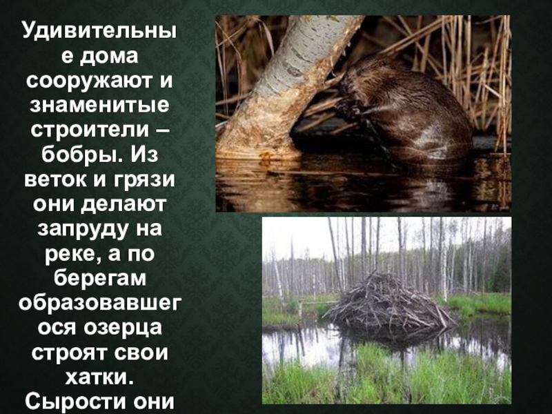 Слайд 12Удивительные дома сооружают и знаменитые строители – бобры. Из веток и
