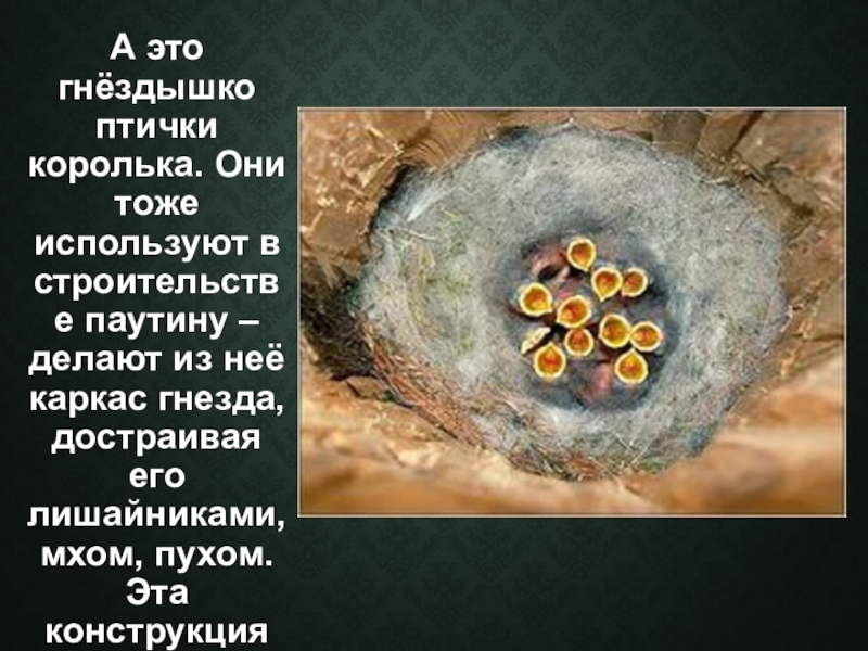 Слайд 15А это гнёздышко птички королька. Они тоже используют в строительстве паутину