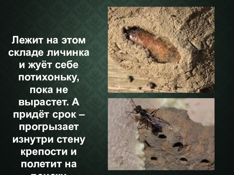 Слайд 8Лежит на этом складе личинка и жуёт себе потихоньку, пока не