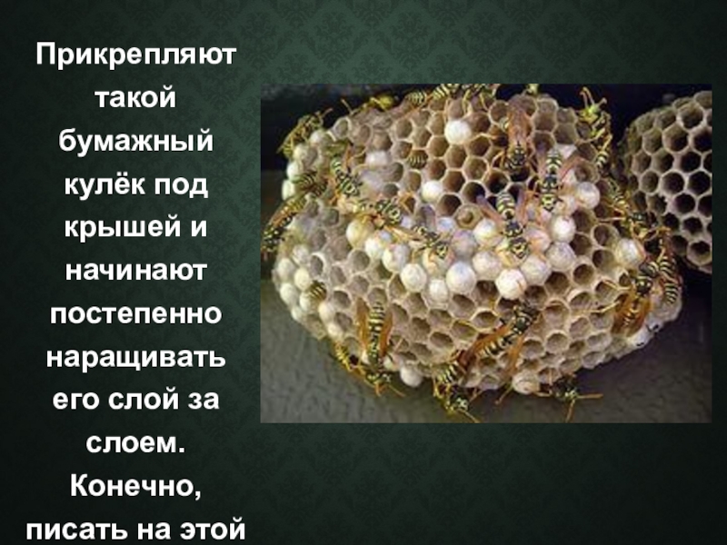 умельцы осы для строительства своих домов делают настоящую… бумагу. Пережёвывают кусочки дерева, скрепляют полученную массу слюной, прессуют, затем лепят из него кулёк.