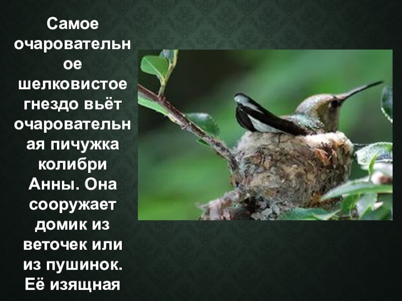 Слайд 14Самое очаровательное шелковистое гнездо вьёт очаровательная пичужка колибри Анны. Она сооружает