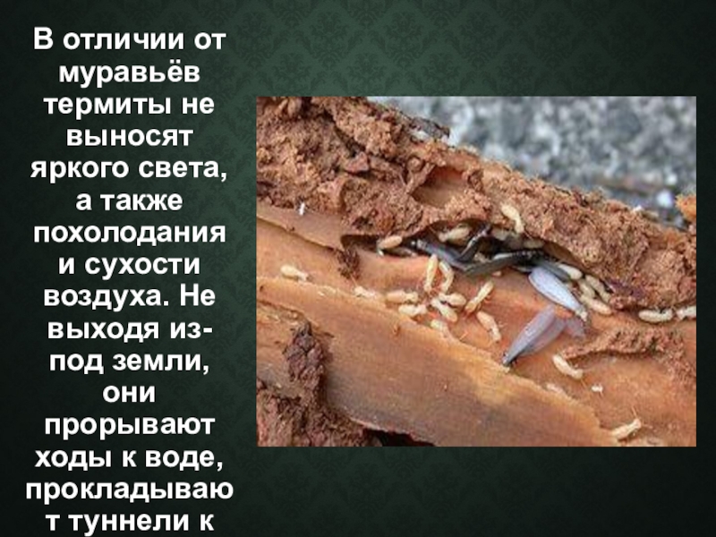 Слайд 10В отличии от муравьёв термиты не выносят яркого света, а также