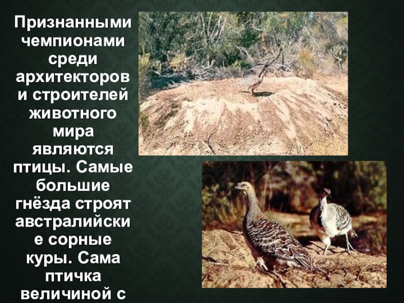 Слайд 13Признанными чемпионами среди архитекторов и строителей животного мира являются птицы. Самые