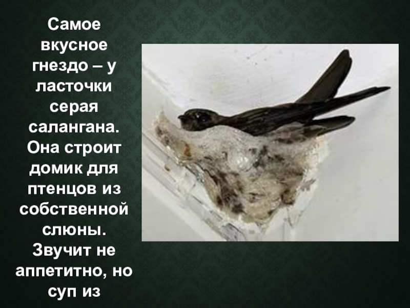 Слайд 19Самое вкусное гнездо – у ласточки серая салангана. Она строит домик