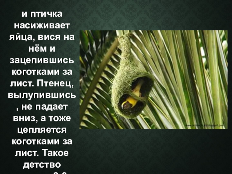 Слайд 18и птичка насиживает яйца, вися на нём и зацепившись коготками за