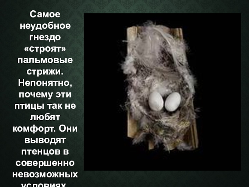 Слайд 17Самое неудобное гнездо «строят» пальмовые стрижи. Непонятно, почему эти птицы так