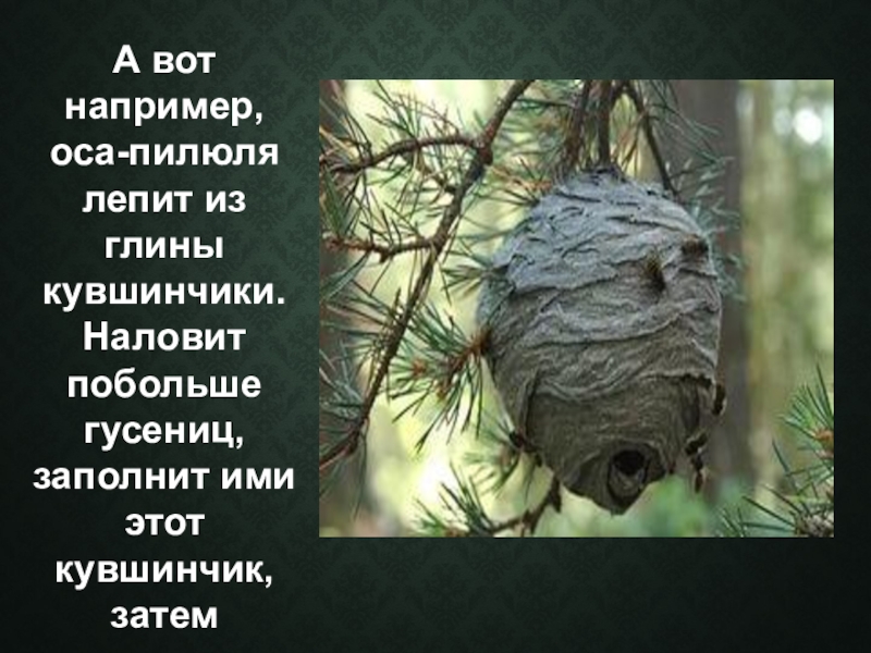 Слайд 6А вот например, оса-пилюля лепит из глины кувшинчики. Наловит побольше гусениц,