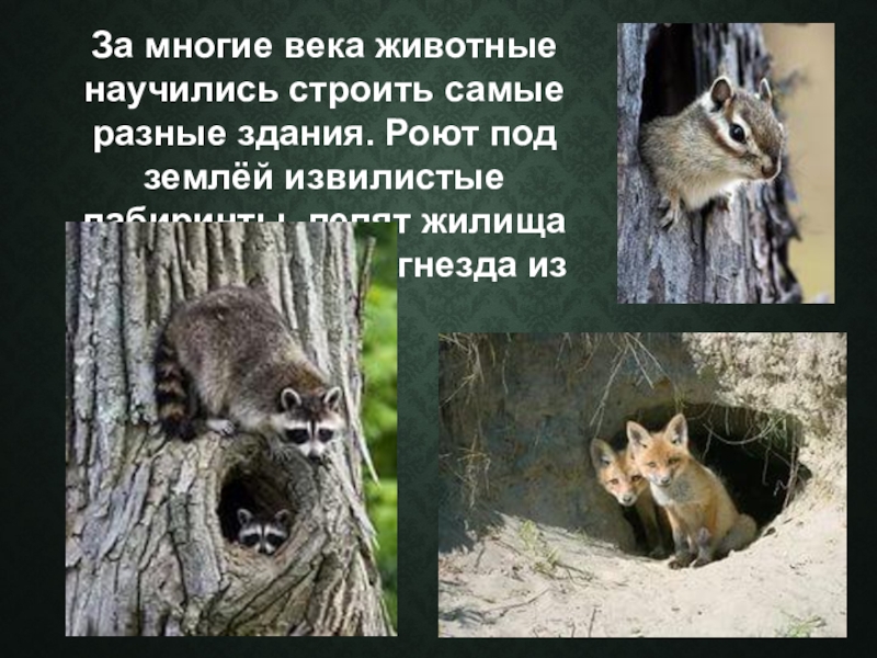 Слайд 3За многие века животные научились строить самые разные здания. Роют под