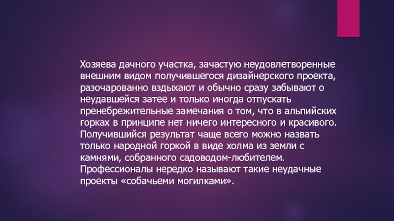 вздыхают и обычно сразу забывают о неудавшейся затее и только иногда отпускать пренебрежительные замечания о том, что в альпийских горках в принципе нет ничего интересного и красивого. Получившийся результат чаще всего можно назвать только народной горкой в виде холма из земли с камнями, собранного садоводом-любителем. Профессионалы нередко называют такие неудачные проекты «собачьеми могилками».