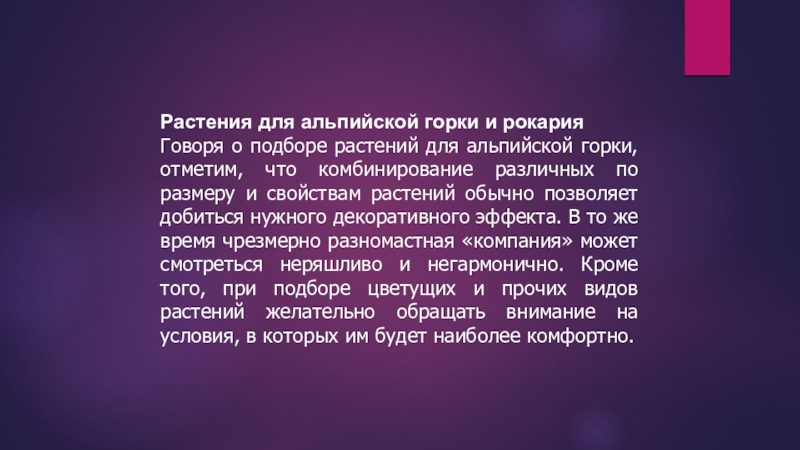 горки, отметим, что комбинирование различных по размеру и свойствам растений обычно позволяет добиться нужного декоративного эффекта. В то же время чрезмерно разномастная «компания» может смотреться неряшливо и негармонично. Кроме того, при подборе цветущих и прочих видов растений желательно обращать внимание на условия, в которых им будет наиболее комфортно.