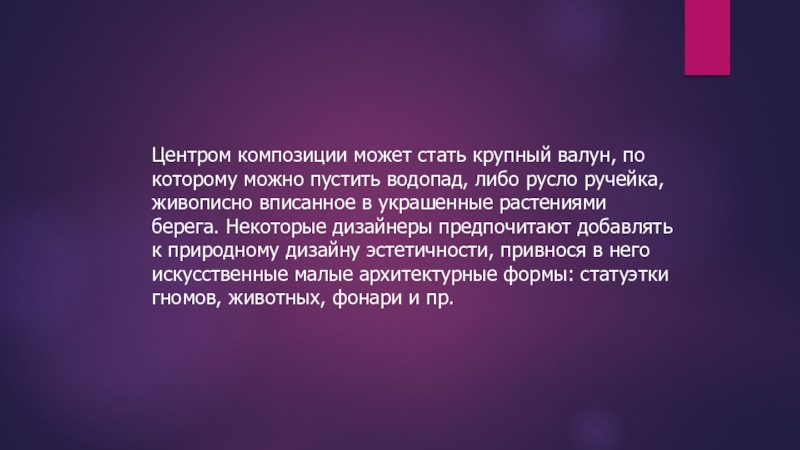 либо русло ручейка, живописно вписанное в украшенные растениями берега. Некоторые дизайнеры предпочитают добавлять к природному дизайну эстетичности, привнося в него искусственные малые архитектурные формы: статуэтки гномов, животных, фонари и пр.