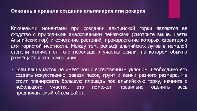 являются ее сходство с природными аналогичными пейзажами (смотрите выше, цветы Альпийских гор) и сочетание растений, произрастание которых характерно для гористой местности. Между тем, рельеф альпийских лугов в немалой степени отличен от того небольшого участка земли, на котором обычно размещается эта композиция.