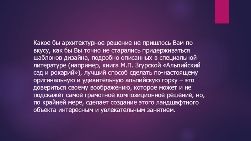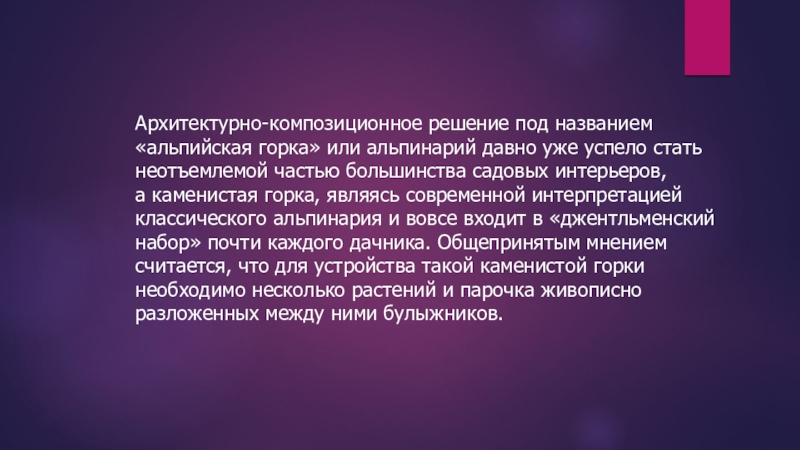 Слайд 2Архитектурно-композиционное решение под названием «альпийская горка» или альпинарий давно уже успело