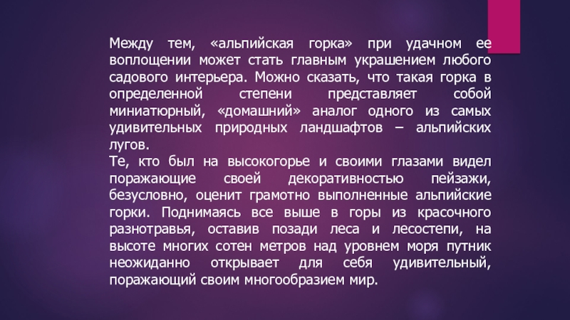Те, кто был на высокогорье и своими глазами видел поражающие своей декоративностью пейзажи, безусловно, оценит грамотно выполненные альпийские горки. Поднимаясь все выше в горы из красочного разнотравья, оставив позади леса и лесостепи, на высоте многих сотен метров над уровнем моря путник неожиданно открывает для себя удивительный, поражающий своим многообразием мир.