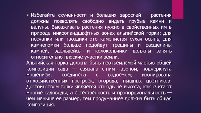 солнце и сухость воздуха. Немаловажное значение имеет расположение цветов внутри пространства самой горки: растения не должны сильно затенять или загораживать друг друга, но в то же время их размещение должно быть довольно компактным, без больших пустот и голой земли.