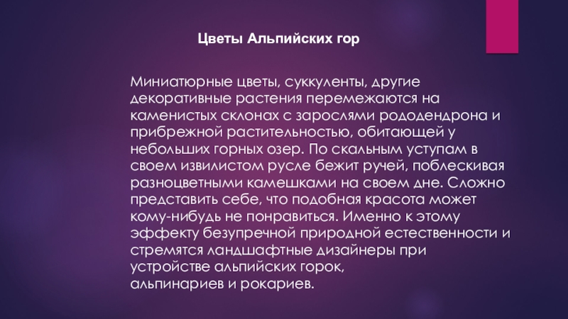 зарослями рододендрона и прибрежной растительностью, обитающей у небольших горных озер. По скальным уступам в своем извилистом русле бежит ручей, поблескивая разноцветными камешками на своем дне. Сложно представить себе, что подобная красота может кому-нибудь не понравиться. Именно к этому эффекту безупречной природной естественности и стремятся ландшафтные дизайнеры при устройстве альпийских горок, альпинариев и рокариев.