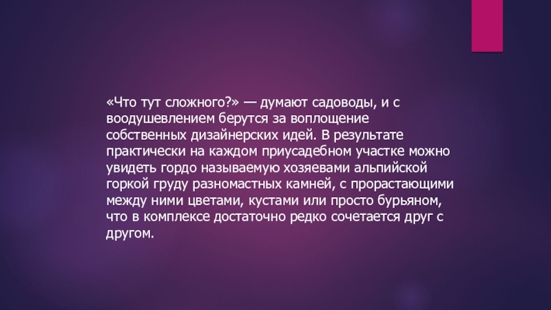 воплощение собственных дизайнерских идей. В результате практически на каждом приусадебном участке можно увидеть гордо называемую хозяевами альпийской горкой груду разномастных камней, с прорастающими между ними цветами, кустами или просто бурьяном, что в комплексе достаточно редко сочетается друг с другом.