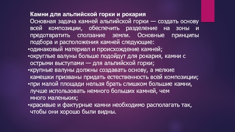создать основу всей композиции, обеспечить разделение на зоны и предотвратить сползание земли. Основные принципы подбора и расположения камней следующие:
