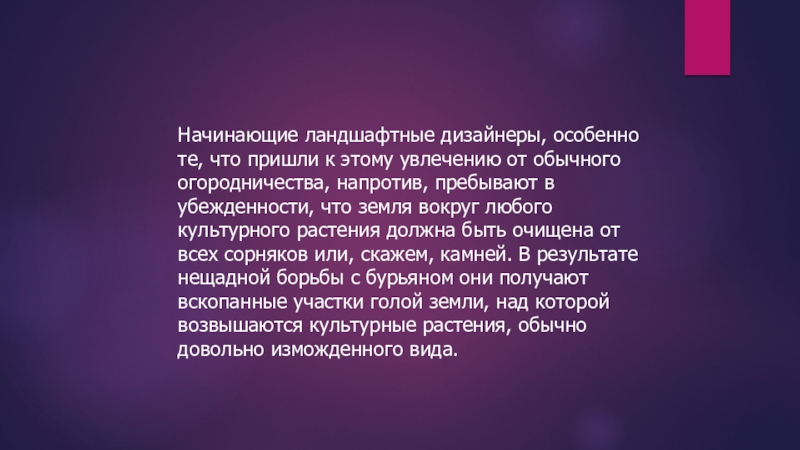 обычного огородничества, напротив, пребывают в убежденности, что земля вокруг любого культурного растения должна быть очищена от всех сорняков или, скажем, камней. В результате нещадной борьбы с бурьяном они получают вскопанные участки голой земли, над которой возвышаются культурные растения, обычно довольно изможденного вида.