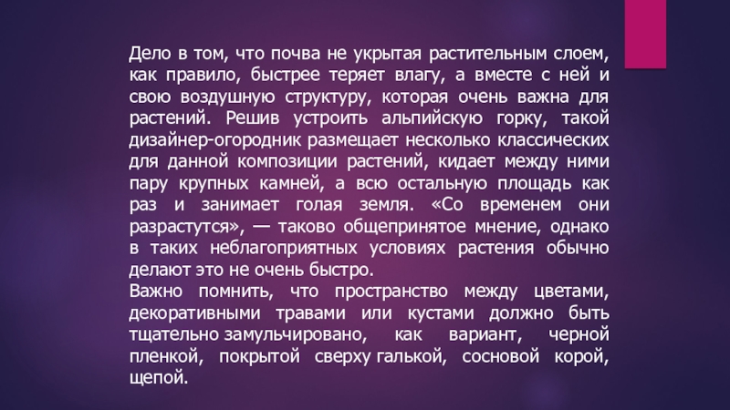быстрее теряет влагу, а вместе с ней и свою воздушную структуру, которая очень важна для растений. Решив устроить альпийскую горку, такой дизайнер-огородник размещает несколько классических для данной композиции растений, кидает между ними пару крупных камней, а всю остальную площадь как раз и занимает голая земля. «Со временем они разрастутся», — таково общепринятое мнение, однако в таких неблагоприятных условиях растения обычно делают это не очень быстро.