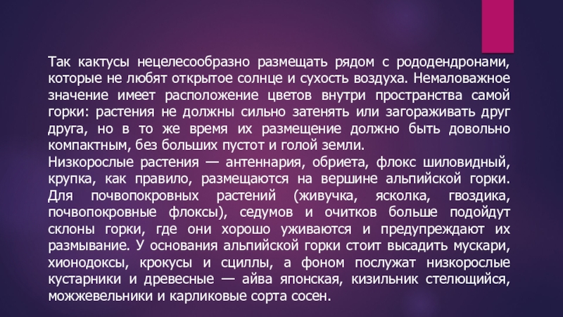 Слайд 16Так кактусы нецелесообразно размещать рядом с рододендронами, которые не любят открытое