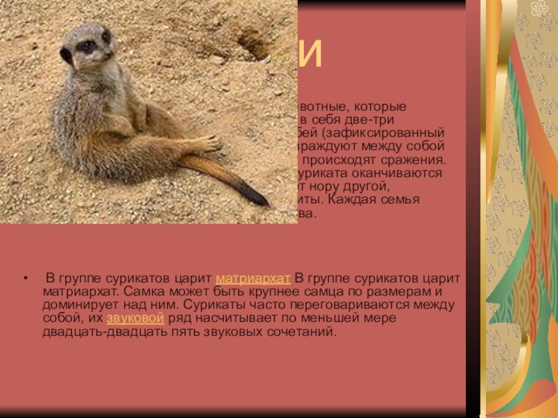В группе сурикатов царит матриархат В группе сурикатов царит матриархат. Самка может быть крупнее самца по размерам и доминирует над ним. Сурикаты часто переговариваются между собой, их звуковой ряд насчитывает по меньшей мере двадцать-двадцать пять звуковых сочетаний.