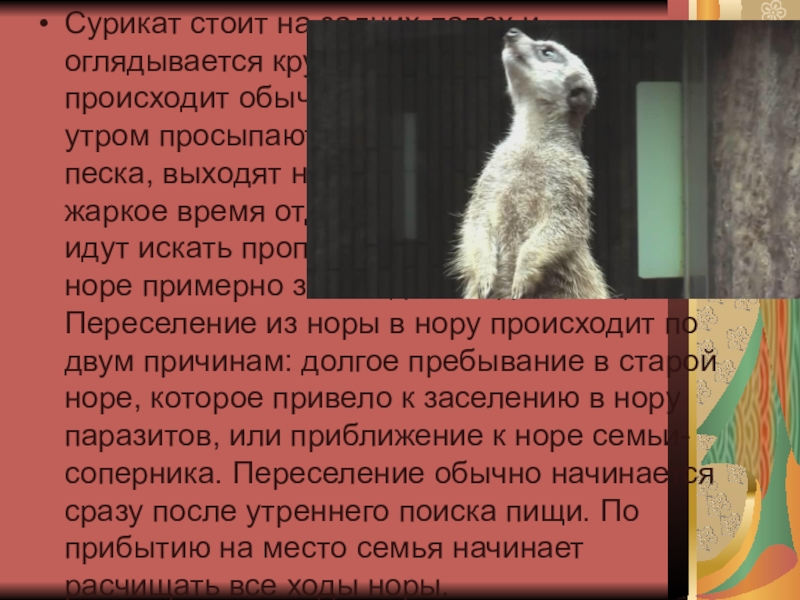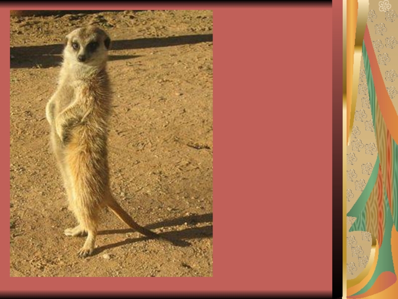 Слайд 9Сурикат стоит на задних лапах и оглядывается кругом.День у сурикатов происходит