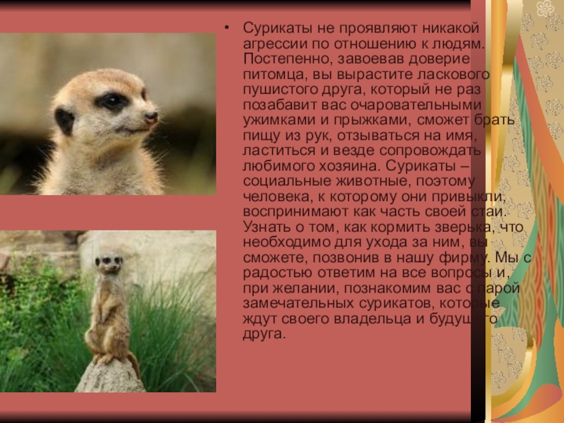 Слайд 13Сурикаты не проявляют никакой агрессии по отношению к людям. Постепенно, завоевав
