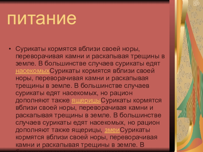 земле. В большинстве случаев сурикаты едят насекомыхСурикаты кормятся вблизи своей норы, переворачивая камни и раскапывая трещины в земле. В большинстве случаев сурикаты едят насекомых, но рацион дополняют также ящерицыСурикаты кормятся вблизи своей норы, переворачивая камни и раскапывая трещины в земле. В большинстве случаев сурикаты едят насекомых, но рацион дополняют также ящерицы, змеиСурикаты кормятся вблизи своей норы, переворачивая камни и раскапывая трещины в земле. В большинстве случаев сурикаты едят насекомых, но рацион дополняют также ящерицы, змеи, скорпионыСурикаты кормятся вблизи своей норы, переворачивая камни и раскапывая трещины в земле. В большинстве случаев сурикаты едят насекомых, но рацион дополняют также ящерицы, змеи, скорпионы, паукиСурикаты кормятся вблизи своей норы, переворачивая камни и раскапывая трещины в земле. В большинстве случаев сурикаты едят насекомых, но рацион дополняют также ящерицы, змеи, скорпионы, пауки, многоножкиСурикаты кормятся вблизи своей норы, переворачивая камни и раскапывая трещины в земле. В большинстве случаев сурикаты едят насекомых, но рацион дополняют также ящерицы, змеи, скорпионы, пауки, многоножки, разные части растительности. Редко мелкие птицыСурикаты кормятся вблизи своей норы, переворачивая камни и раскапывая трещины в земле. В большинстве случаев сурикаты едят насекомых, но рацион дополняют также ящерицы, змеи, скорпионы, пауки, многоножки, разные части растительности. Редко мелкие птицы. У сурикатов есть иммунитетСурикаты кормятся вблизи своей норы, переворачивая камни и раскапывая трещины в земле. В большинстве случаев сурикаты едят насекомых, но рацион дополняют также ящерицы, змеи, скорпионы, пауки, многоножки, разные части растительности. Редко мелкие птицы. У сурикатов есть иммунитет к некоторым ядам; у них устойчивость к яду скорпиона, обитающего в пустыне Калахари (в отличие от человека).
