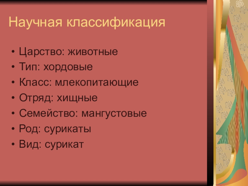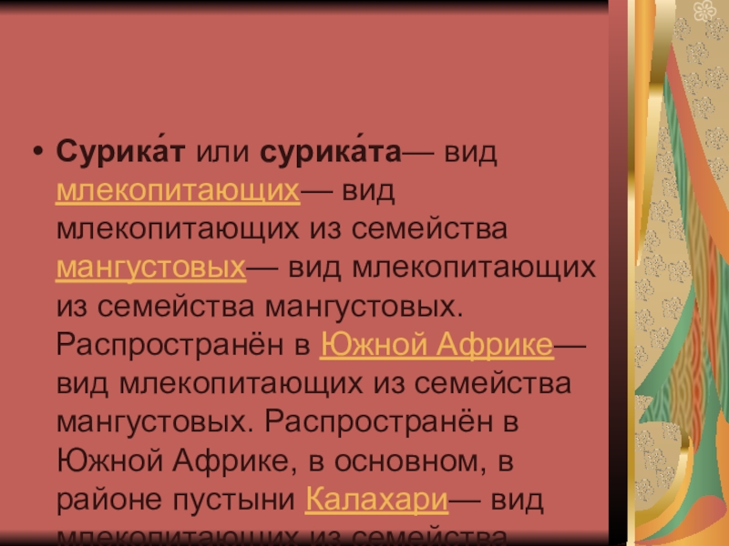Сурика́т или сурика́та— вид млекопитающих— вид млекопитающих из семейства мангустовых— вид