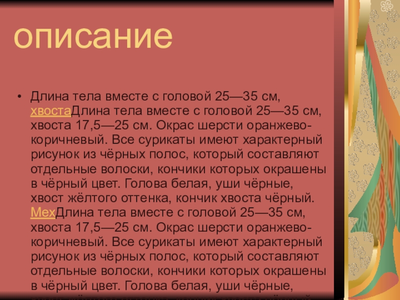 25—35 см, хвоста 17,5—25 см. Окрас шерсти оранжево-коричневый. Все сурикаты имеют характерный рисунок из чёрных полос, который составляют отдельные волоски, кончики которых окрашены в чёрный цвет. Голова белая, уши чёрные, хвост жёлтого оттенка, кончик хвоста чёрный. МехДлина тела вместе с головой 25—35 см, хвоста 17,5—25 см. Окрас шерсти оранжево-коричневый. Все сурикаты имеют характерный рисунок из чёрных полос, который составляют отдельные волоски, кончики которых окрашены в чёрный цвет. Голова белая, уши чёрные, хвост жёлтого оттенка, кончик хвоста чёрный. Мех длинный и мягкий, подшёрсток тёмно-рыжий. Шерсть на животе и груди короткая. Телосложение у суриката стройное, но его скрывает густой мех. На передних лапах длинные и крепкие когти.