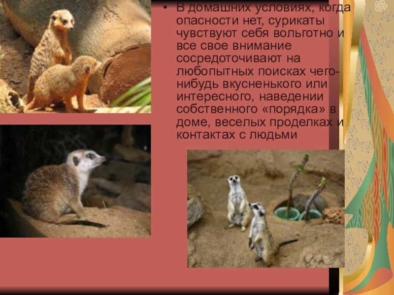 Слайд 14В домашних условиях, когда опасности нет, сурикаты чувствуют себя вольготно и
