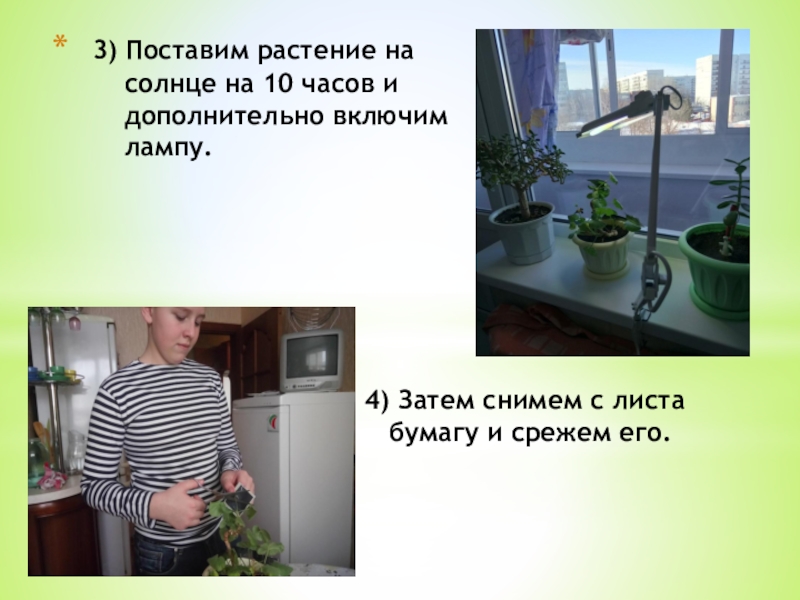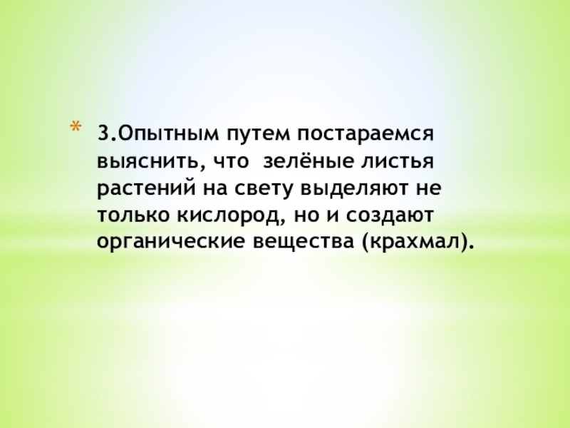 Слайд 123.Опытным путем постараемся выяснить, что зелёные листья растений на свету выделяют
