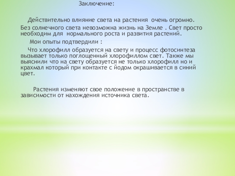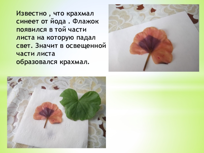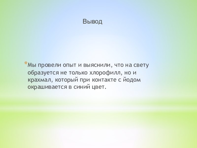 Что хлорофилл образуется на свету и процесс фотосинтеза вызывает только поглощенный хлорофиллом свет. Также мы выяснили что на свету образуется не только хлорофилл но и крахмал который при контакте с йодом окрашивается в синий цвет.