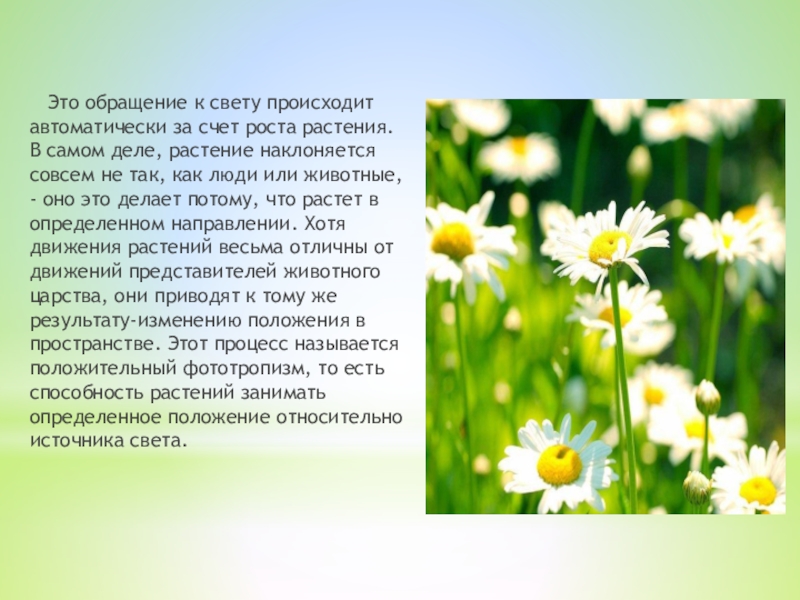 растения. В самом деле, растение наклоняется совсем не так, как люди или животные, - оно это делает потому, что растет в определенном направлении. Хотя движения растений весьма отличны от движений представителей животного царства, они приводят к тому же результату-изменению положения в пространстве. Этот процесс называется положительный фототропизм, то есть способность растений занимать определенное положение относительно источника света.