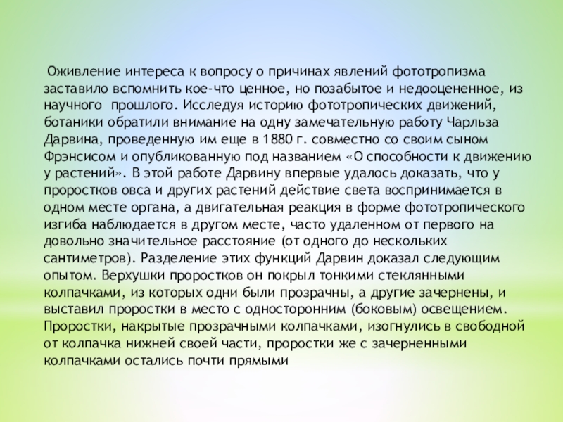 Слайд 22 Оживление интереса к вопросу о причинах явлений фототропизма заставило