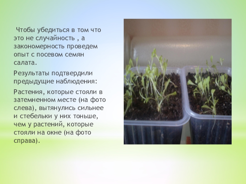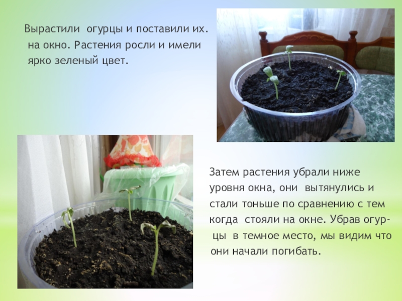 Растения, которые стояли в затемненном месте (на фото слева), вытянулись сильнее и стебельки у них тоньше, чем у растений, которые стояли на окне (на фото справа).