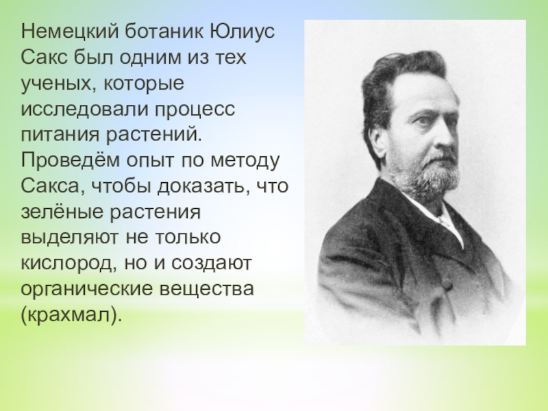 Слайд 13Немецкий ботаник Юлиус Сакс был одним из тех ученых, которые исследовали