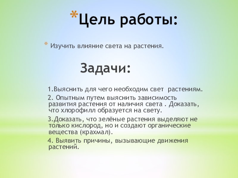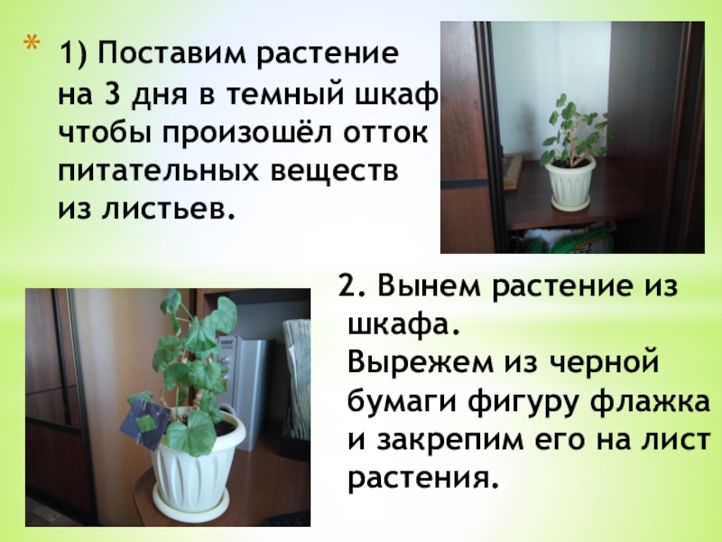 2. Опытным путем выяснить зависимость развития растения от наличия света . Доказать, что хлорофилл образуется на свету.