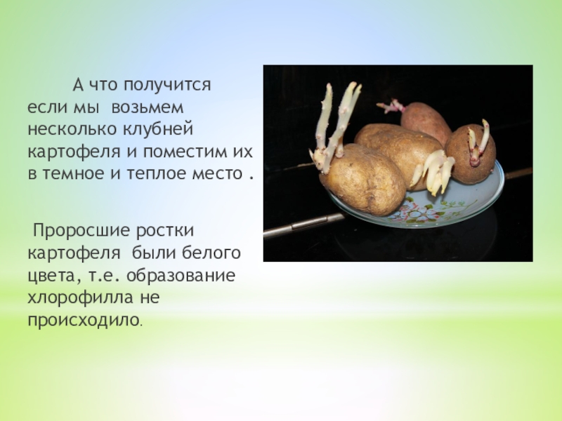 Проросшие ростки картофеля были белого цвета, т.е. образование хлорофилла не происходило.