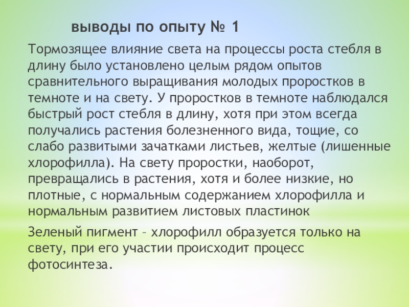 света на процессы роста стебля в длину было установлено целым рядом опытов сравнительного выращивания молодых проростков в темноте и на свету. У проростков в темноте наблюдался быстрый рост стебля в длину, хотя при этом всегда получались растения болезненного вида, тощие, со слабо развитыми зачатками листьев, желтые (лишенные хлорофилла). На свету проростки, наоборот, превращались в растения, хотя и более низкие, но плотные, с нормальным содержанием хлорофилла и нормальным развитием листовых пластинок