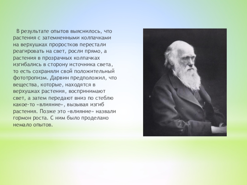 верхушках проростков перестали реагировать на свет, росли прямо, а растения в прозрачных колпачках изгибались в сторону источника света, то есть сохраняли свой положительный фототропизм. Дарвин предположил, что вещества, которые, находятся в верхушках растения, воспринимают свет, а затем передают вниз по стеблю какое-то «влияние», вызывая изгиб растения. Позже это «влияние» назвали гормон роста. С ним было проделано немало опытов.