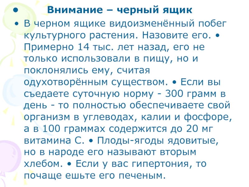 видоизменённый побег культурного растения. Назовите его. • Примерно 14 тыс. лет назад, его не только использовали в пищу, но и поклонялись ему, считая одухотворённым существом. • Если вы съедаете суточную норму - 300 грамм в день - то полностью обеспечиваете свой организм в углеводах, калии и фосфоре, а в 100 граммах содержится до 20 мг витамина С. • Плоды-ягоды ядовитые, но в народе его называют вторым хлебом. • Если у вас гипертония, то почаще ешьте его печеным.