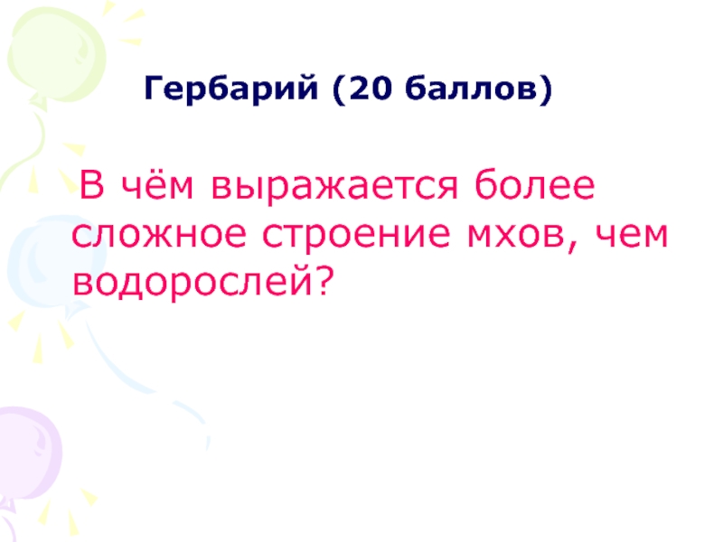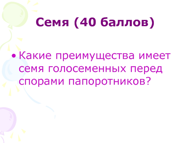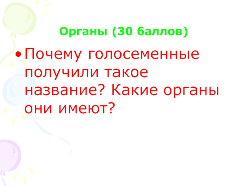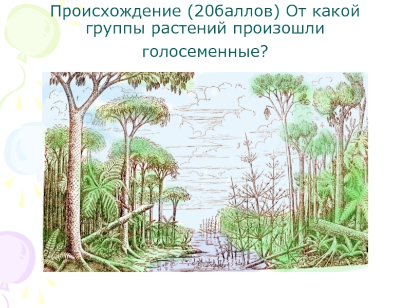 Слайд 31Происхождение (20баллов) От какой группы растений произошли голосеменные?