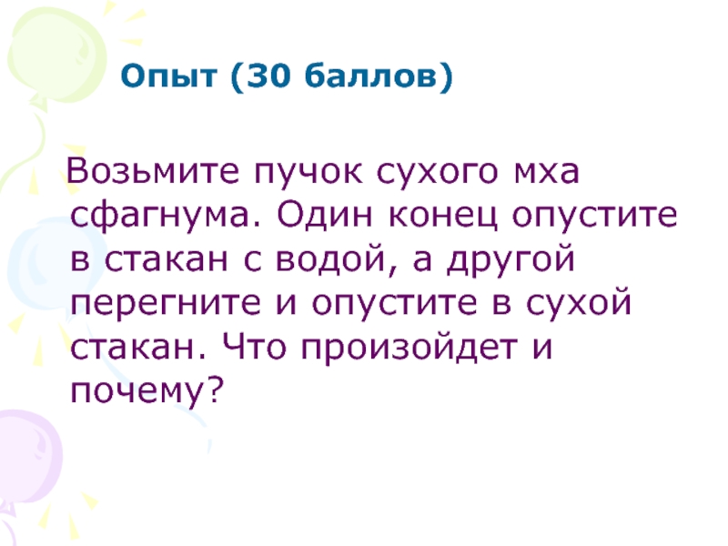 мха сфагнума. Один конец опустите в стакан с водой, а другой перегните и опустите в сухой стакан. Что произойдет и почему?