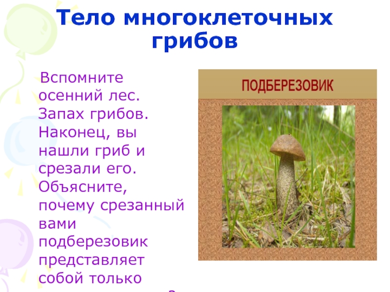 нашли гриб и срезали его. Объясните, почему срезанный вами подберезовик представляет собой только часть организма?